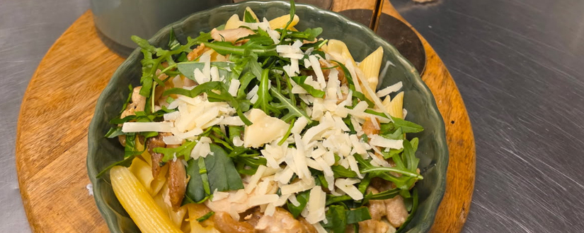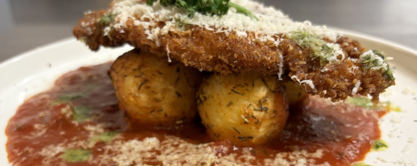 | Chicken parm (panerad kyckling, rostad potatis, tomatsås) |