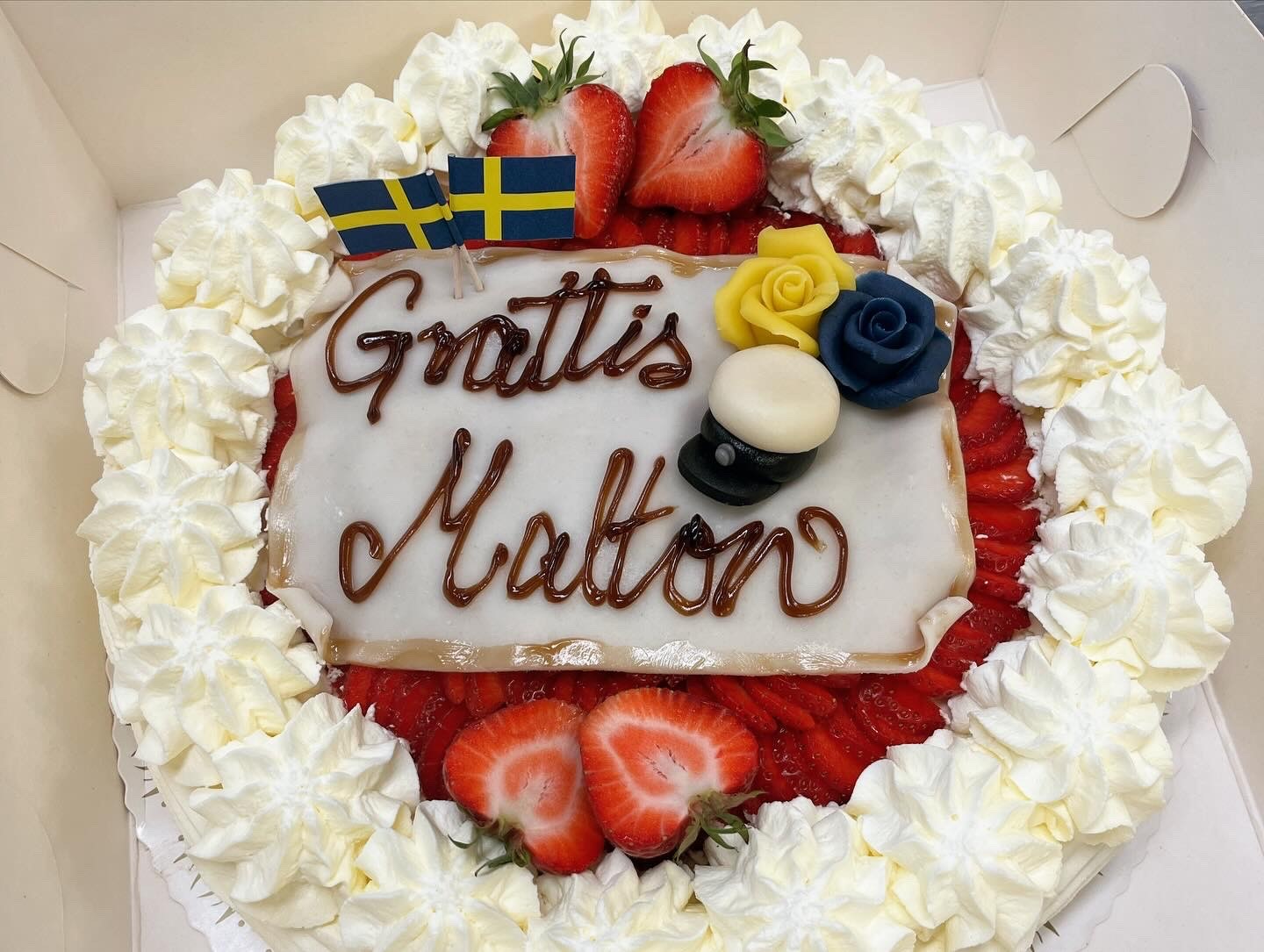 Gräddtårta med färska jordgubbar, jordgubbssylt, studenthatt och text.
